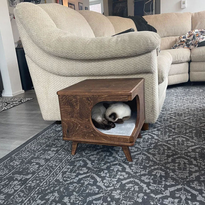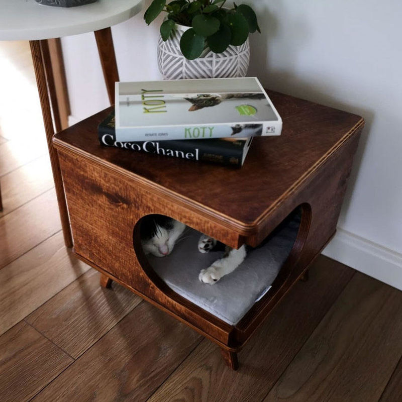 أثاث الحيوانات الأليفة طاولة جانبية Wood Cat House دافئ خشبي على شكل قطة سرير منزل صندوق ريفي