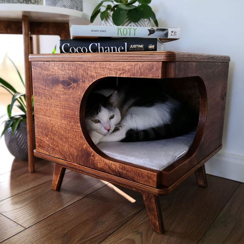 متاجر الحيوانات الأليفة أو مربية الحيوانات الأليفة: غالبًا ما توفر متاجر الحيوانات الأليفة أو مربية الحيوانات الأليفة مأوى للقطط بجانب السرير لتوفير منطقة مريحة وآمنة لزيارة القطط ، بالإضافة إلى طاولة سرير وظيفية للمالك.