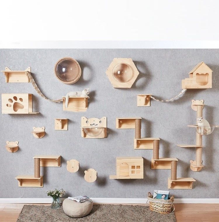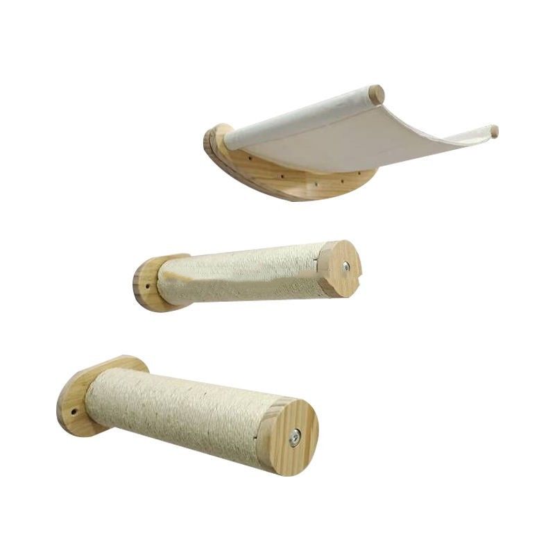 عمود التسلق أو لوح المخلب: قد يتم تجهيز مجموعات إطارات تسلق القطط المثبتة على الحائط بعمود تسلق أو لوح مخلب لتوفير المزيد من فرص الترفيه والتمرين للقطط.عادة ما تكون أعمدة التسلق وألواح الخدش مصنوعة من مادة خشبية ، مما يزيد من متعة ونشاط القطة.